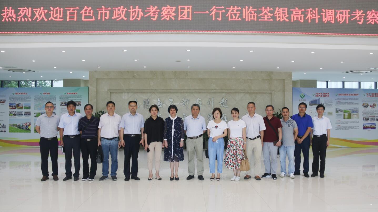 ??? 2019年7月8日下午,廣西壯族自治區(qū)百色市政協(xié)副主席蔡文姬率考察團一行蒞臨荃銀高科調(diào)研考察。合肥市政協(xié)人資環(huán)委主任張立、市農(nóng)業(yè)農(nóng)村局副局長李軍、高新區(qū)農(nóng)村工作局副局長江水等領(lǐng)導陪同調(diào)研。荃銀高科副董事長兼總經(jīng)理張琴、副總經(jīng)理兼首席技術(shù)官張從合、財務總監(jiān)張慶一等領(lǐng)導熱情接待了考察團一行。